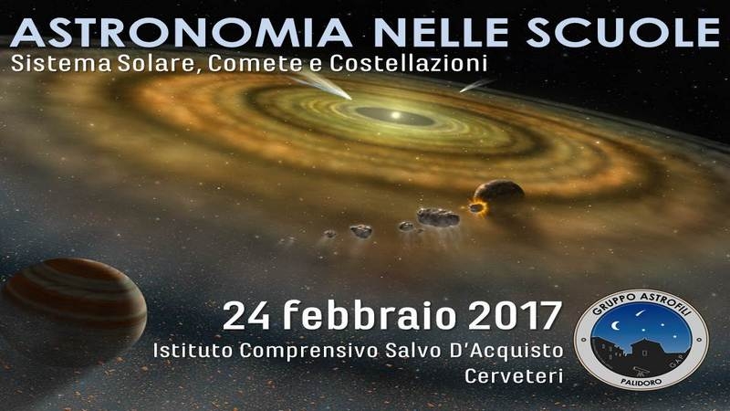Venerdì 24 febbraio l’Astronomia passa per la scuola I.C. Salvo D’Acquisto di Cerveteri. Il Gruppo Astrofili Palidoro mostrerà a 150 ragazzi delle classi Terze Medie le affascinanti nozioni riguardanti il Sistema Solare, le Comete e le Costellazioni. Un viaggio alla scoperta delle meraviglie dell’Universo condotto dall’astrofilo Giuseppe Conzo che con slide interattive terrà per tutta la mattinata lezioni di Astronomia.