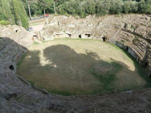 L’anfiteatro di epoca romana (tra il I secolo a.C. e il I sec. d.C.) è scavato nel tufo senza l’ausilio di murature di sostegno ed è uno dei pochissimi manufatti al mondo di questo tipo. Alcuni cunicoli sottostanti permettevano l’accesso alle gradinate che potevano contenere fino a settemila spettatori. Come il Colosseo, l’anfiteatro ha una pianta ellittica con tre ordini di gradinate e si presume fosse arricchito da un coronamento di colonne e statue. Rimase sconosciuto fino agli inizi dell’ottocento, perché quasi completamente interrato in una zona destinata a colture agricole.