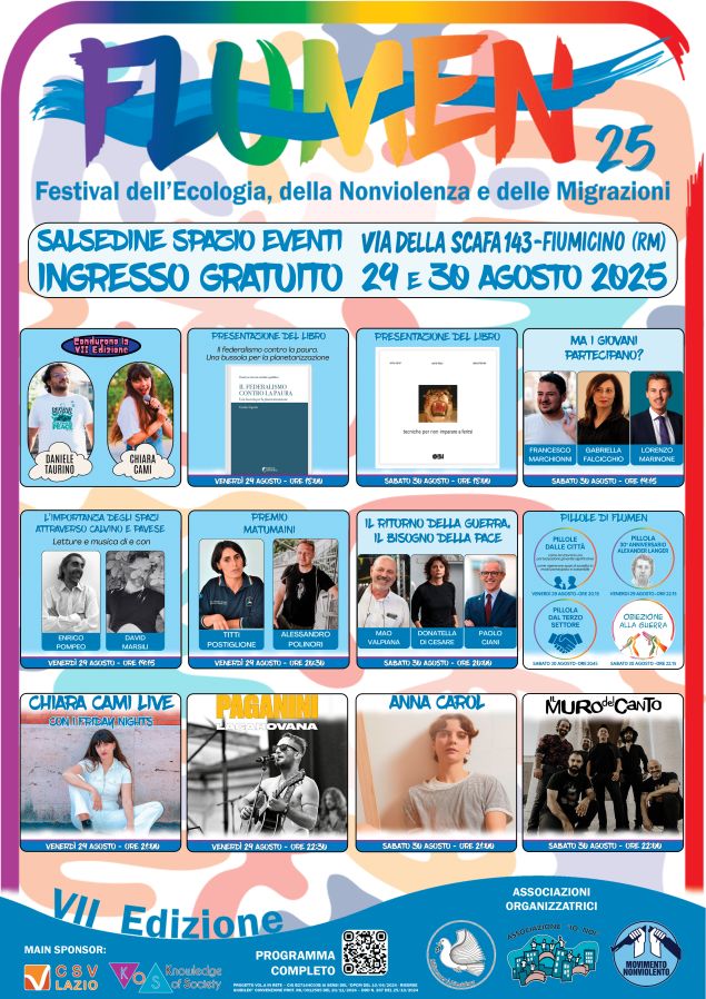 Flumen 2025 si presenta con un programma ricchissimo sul piano culturale e impreziosito sul piano dello spettacolo e sarà condotto da Daniele Taurino (Direttore artistico) e da Chiara Cami, performer e cantante. Tutti gli eventi saranno seguiti e raccontati dai media partner “Reti solidali”, la rivista online del CSV Lazio, nonché come sempre, da “Azione nonviolenta”, la rivista del Movimento Nonviolento fondata da Aldo Capitini nel 1964.