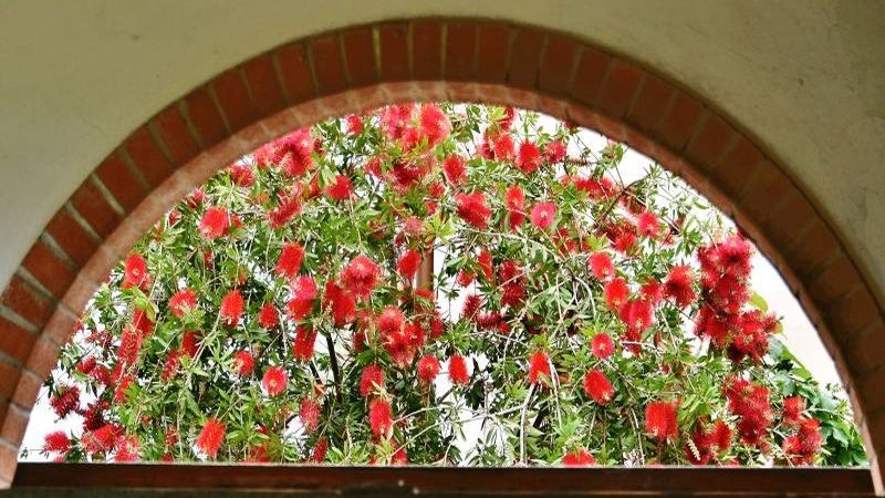 Un arco, con vista di tantissimi scovolini fioriti, un enorme ventaglio colorato di questa pianta dalle origini australiane ormai comune un pò ovunque con la sua particolarità davvero unica.