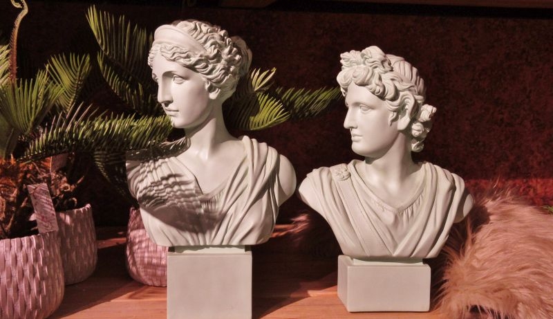 Questi due busti così ben scolpiti, hanno aggiunto altrettanta bellezza in questa vetrina creata con grande maestria da fioristi esperti.
