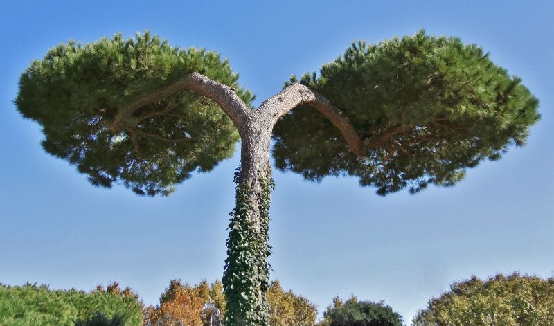 Mi convinco sempre più che la natura è incredibile. Questo pino, sicuramente unico nella sua forma, è formato da un robusto tronco e più in alto diviso in altri due tronchi uguali con tanti rami e con la classica forma dell’infinito.