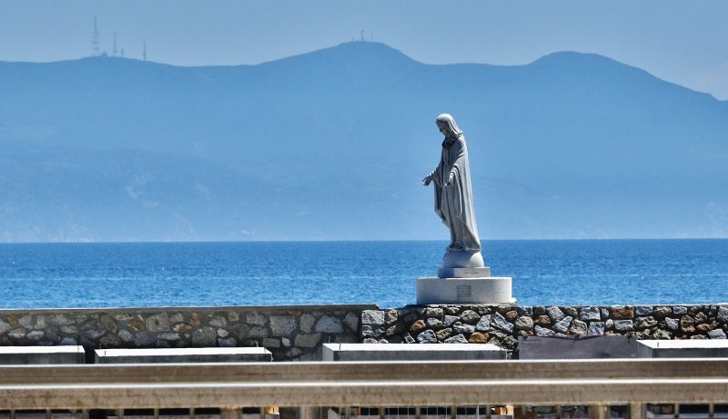 Accanto agli scogli la statua di marmo bianco della Madonna “Stella Maris”