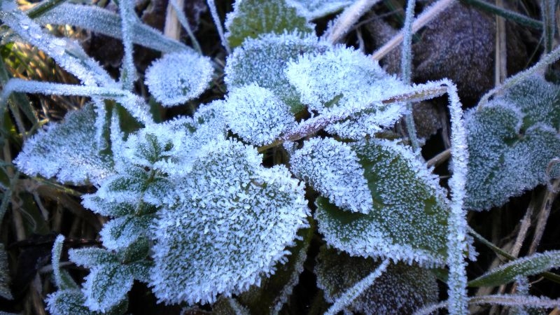 La mattina però, si risente del freddo pungente della notte e soprattutto ho notato quelle minuscole particelle di cristallo che ricoprono le foglie di molte piante erbacee che crescono qua e là.
