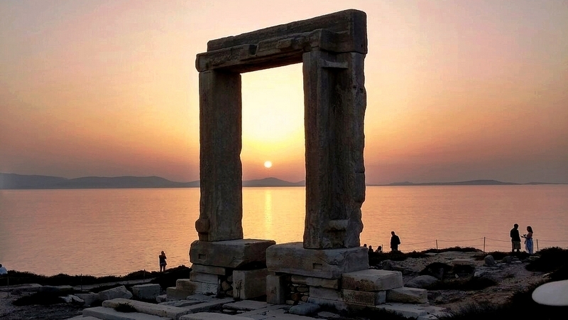 Siamo nell’isola di Naxos e naturalmente non poteva mancare questa grande porta che è un pò il suo simbolo. E’ stata chiamata “Portara” e questo rudere è ciò che resta dell’enorme ingresso appartenente al grande tempio costruito in onore del Dio Apollo nel lontanissimo 500 a.C. tutto il resto è andato distrutto dai tanti saccheggi, inondazioni e terremoti che si sono susseguiti nei secoli. In questa foto, con le mura al tramonto, la Portara sembra ancora più grande, unica testimonianza di un glorioso passato.