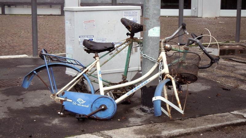 Non tutti sanno che il grande Gino Bartali si serviva della bicicletta per salvare la vita degli ebrei portando dei messaggi nascosti nella canna della sua bicicletta. E cosi’ queste due biciclette abbandonate incatenate, ormai arrugginite e derubate di quasi tutto mi fanno pensare anche a come sono cambiati i tempi e al poco valore che diamo a tutto ciò che abbiamo. Comunque cara bicicletta, grazie di esistere!