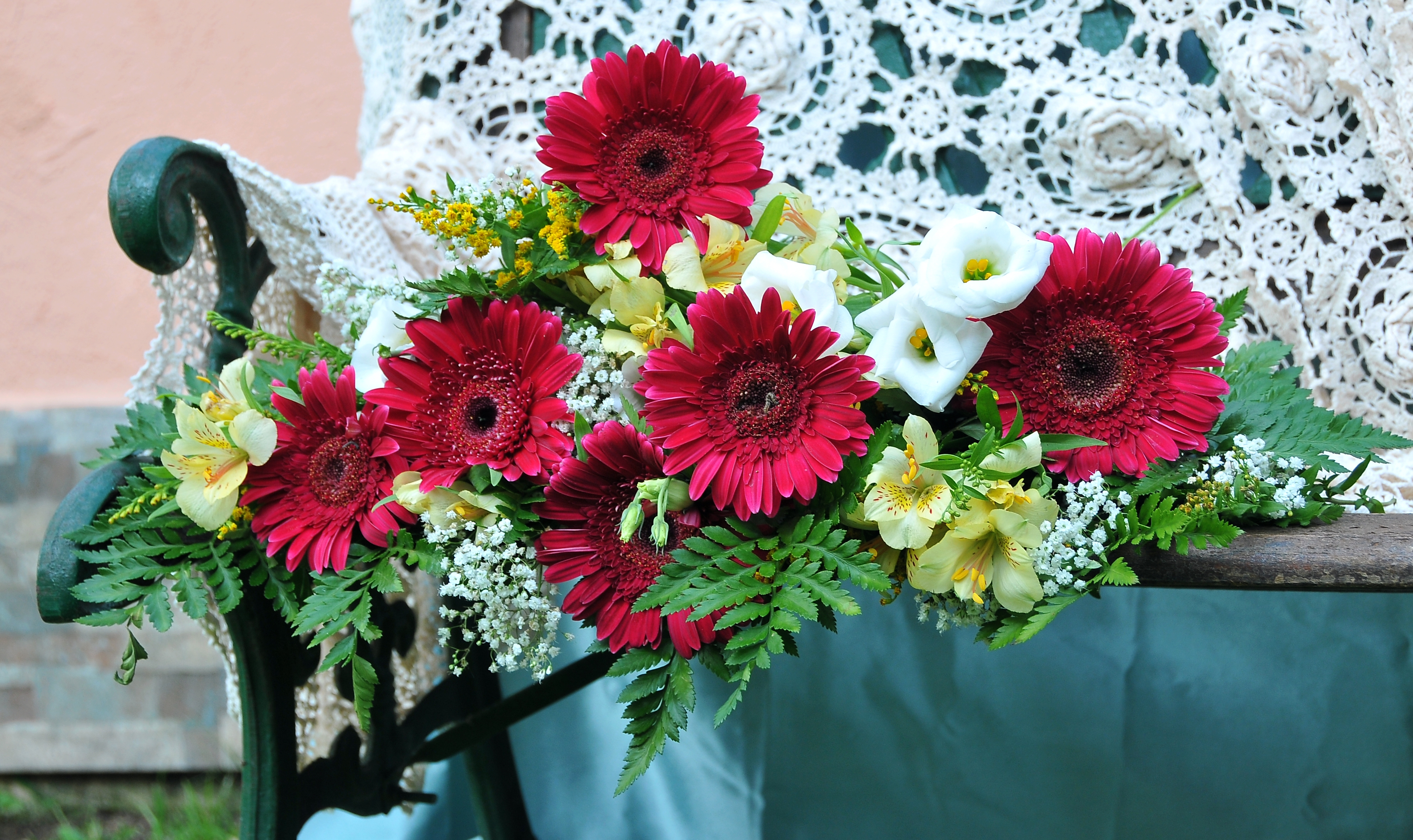 Osservando la natura viene fuori di tutto e di più in positivo e in bellezza. Osservando bene questi fiori appoggiati su una panchina in giardino, possiamo capire il loro linguaggio: il bianco, dove c’è il fiore bianco, vuol dire purezza, il giallo vuol dire gelosia, il fiore rosso vuol dire passione, il verde vuol dire speranza e tutto intorno un semplice centrino bianco ricamato a mano.