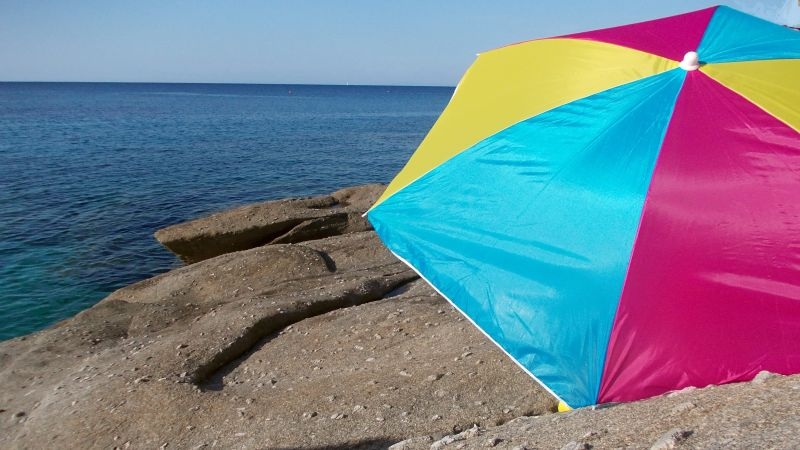 Chi puo’ mai esserci sotto un ombrellone cosi’ colorato appoggiato sugli scogli?