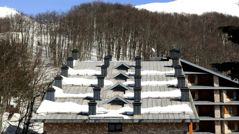 Siamo al Terminillo, zona sciistica tra Roma e Rieti e questo è il tetto di uno dei tanti alberghi confortevoli che, come si vede, ha ancora la neve sul tetto. Presto si scioglierà del tutto, così come gli alberi che sono ancora grigi per il letargo invernale, ritorneranno verdi e ricchi di germogli e foglie.