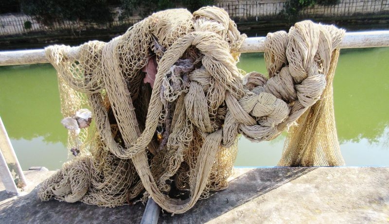 L’ho vista così, appoggiata e attorcigliata. Mi è parso di sentire la sua vocina che mi diceva: “Sono stata una fedele lavoratrice per moltissimi anni, ho intrappolato e portato in barca migliaia di pesci, ho rattoppi un pò ovunque, sono scolorita e bucata, ora non servo più, sono spazzatura e attendo il mio triste destino finale”.
