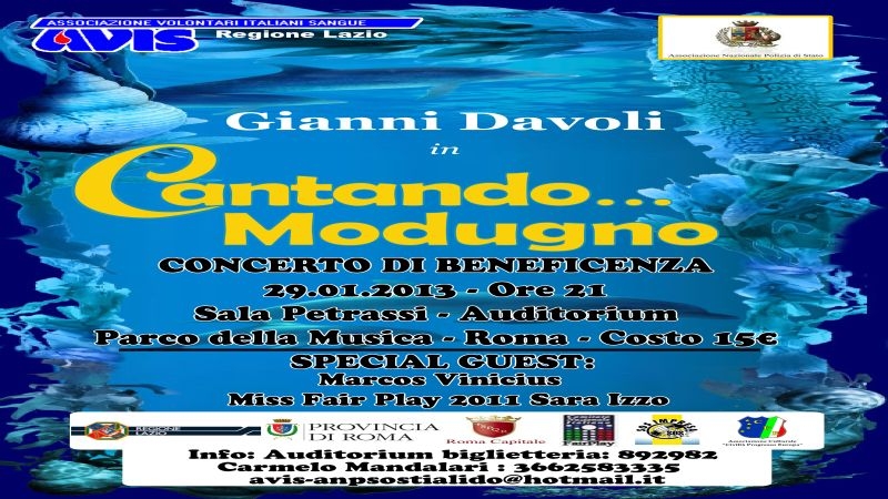 Martedì 29 gennaio alle ore 21.00, presso la Sala Petrassi dell’Auditorium Parco della Musica a Roma, si terrà il concerto di beneficenza “Cantando Modugno”, organizzato in collaborazione con l’Avis, Anps, Comitato Nazionale Italiano Fair Play, S.O.S. Impresa e Associazione Civiltà Progresso Europa.